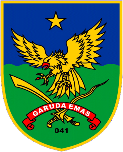 ARTI LAMBANG KOMANDO RESOR MILITER 041/GARUDA EMAS Nama lambang : ”GARUDA EMAS” Rincian Lambang : Diatas Burung Garuda Emas terdapat Bintang Bersegi Lima. Burung Garuda Emas dengan sayap terkembang Burung Garuda Emas dan Jumbai warna kuning emas Pedang dan Keris berwarna Kuning emas, tangkai warna coklat menyilang dibelakang tulisan Garuda Emas Diatas dasar kain berwarna hijau lumut Arti dan Makna Lambang Burung Garuda Emas pada Duwaja Korem 041/Gamas. Bintang bersegi lima merupakan lambang Ketuhanan Yang Maha Esa, yang mengandung makna bahwa setiap Prajurit Korem 041/Garuda Emas dalam bertugas selalu menjunjung tinggi nilai Ketuhanan YME, dan Agama sebagai pedoman dalam kehidupan Prajurit. Burung Garuda mengandung arti : “ Kebesaran dan kepercayaan yang kokoh, Garuda Emas sebagai simbul Penguasa dan Pelindung serta menjunjung tinggi jiwa pahlawan. Burung Garuda Emas dengan paruh dan kuku yang berwarna merah melihat kebawah mengandung arti sikap yang selalu jujur dan berani, sedangkan kakinya berwarna coklat mengandung arti siap menghadapi setiap ancaman yang akan timbul . Terbang dengan megahnya di angkasa diatas wilayah Korem 041/Garuda Emas dengan ekor yang mengembang sejumlah 7 helai melambangkan ”SAPTA MARGA” yang menjadi dasar hidup prajurit KOREM 041/ GARUDA EMAS. Pedang dan Keris berwarna kuning emas dengan tangkai warna coklat yang menyilang dibelakang tulisan Garuda Emas mempunyai arti ”menjunjung tinggi Budaya dan Adat Istiadat masyarakat Bengkulu , kewaspadaan dan kesiap siagaan yang bermakna setiap Prajurit Korem 041/Garuda Emas senantiasa waspada dan penuh kesiap siagaan dalam mengemban tugas pokoknya serta mempertahankan wilayahnya dari setiap ancaman musuh yang datang dari dalam dan luar Negeri yang ingin merong-rong kewibawaan NKRI ” Bulu-bulu kecil pada sayap berjumlah 24 helai melambangkan tanggal lahir, 2 helai bulu di bawah leher melambangkan bulan Februari , sedangkan bulu-bulu pada leher sebanyak 19 helai dan pada dada sebanyak 46 helai kesemuanya mengandung arti “ Tanggal 24 bulan 2 tahun 1946 menandakan tahun berdirinya Korem 041/Gamas”. Bulu sayap besar berjumlah 8 helai melambangkan delapan wajib TNI, mengandung makna bahwa Prajurit 041/Gamas senantiasa menjunjung tinggi 8 wajib TNI sebagai sendi dalam kehidupan dan pelaksanaan tugas. Tata Warna Dasar kain beludru Hijau Lumut melambangkan bumi yang makmur dan mempunyai tanah yang subur dengan sumber daya alam yang melimpah. Warna Kuning Emas mengandung arti kejayaan dan keagungan serta bangga hidup bercita – citakan di alam kemerdekaan. Tulisan GARUDA EMAS dengan huruf putih di bawah dasar merah berarti : dimasa silam, menunjukan keberanian, pantang mundur, pantang menyerah serta mempunyai Budi luhur dalam mempertahankan kemerdekaan Bangsa Indonesia Sang Merah Putih sebagai lambang negara berarti : Bendera Kebangsaan Indonesia yang menjadi lambang persatuan Bangsa Indonesia dengan huruf putih dalam arti suci dan dasar merah berarti berani, setiap saat siap sedia menghadapi segala tantangan.